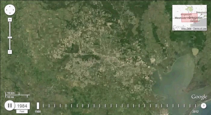 德克萨斯州的城市在过去几十年中扩展了多少?我相信“卡车装”是合适的地方答案,现在我们实际上可以看到这些城市中心像粘菌一样扩散,通过一系列惊人的基于卫星的动画。