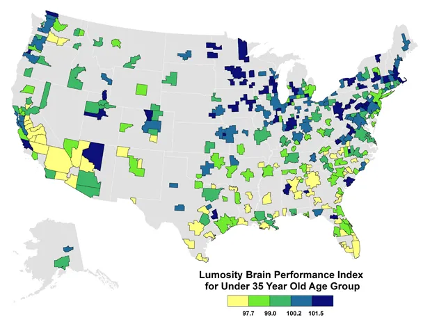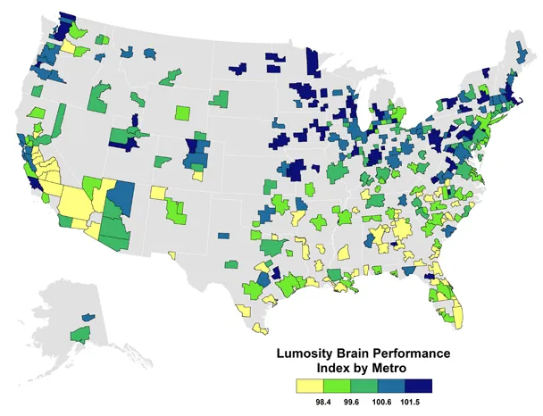 今年的分析显著扩展,基于240万用户的数据。排名涵盖五个关键认知领域:记忆、处理速度、灵活性、注意力和问题解决。(请查看他们的酷炫互动地图 在这里。)数据被标准化为一个基本的大脑表现指数,控制年龄和性别。位置数据来自玩家的IP地址,分数被汇总到城市和大都市层面。