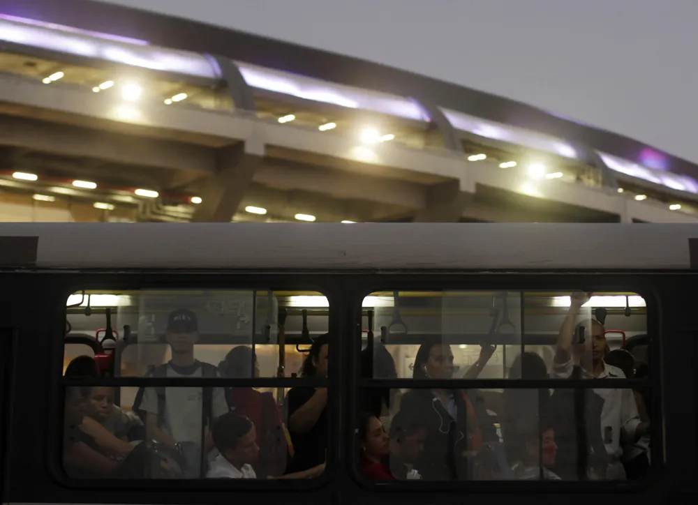 2013年6月7日,在里约热内卢的高峰时段,人们在经过马拉卡纳体育场的公共汽车内。马拉卡纳体育场是即将举行的联合会杯的场馆之一。对于2亿巴西人来说,这场比赛是系列重大事件中的第一次,这些事件将对他们的国家、他们的第一世界雄心以及政府在拉丁美洲最大经济体信心减弱的背景下,兑现转变巴西的承诺能力产生重要影响。图片拍摄于2013年6月7日。路透社/里卡多·莫拉斯