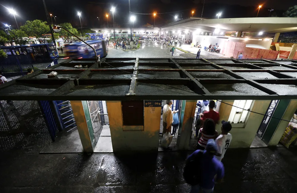 在2013年6月21日,累西腓市的公交车站,人们试图上车,而其他人则试图下车。路透社/里卡多·莫拉斯