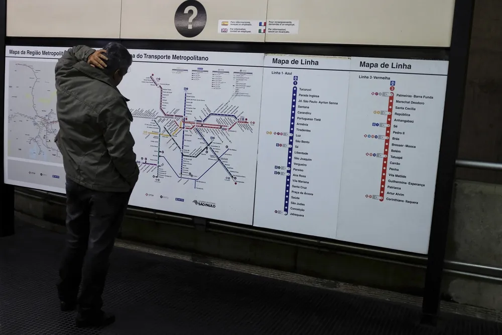 一名通勤者在2013年5月29日的圣保罗市中心地铁站查看火车路线图。路透社/纳乔·多塞