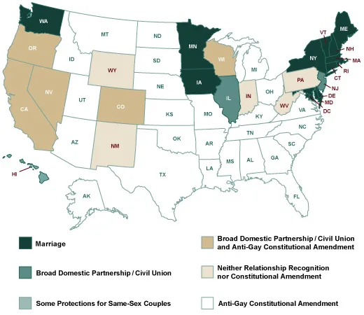 四年前,当对加利福尼亚州提案8的法律挑战开始时,只有三个州确保了同性婚姻的权利。今天,12个州和哥伦比亚特区做到了这一点。它们在倡导组织 自由结婚 的地图上以森林绿色标出: