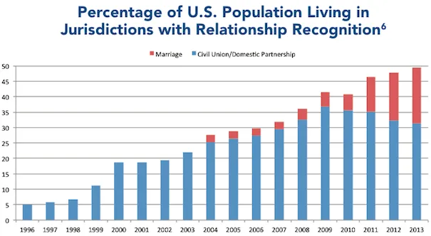 这张来自 智库第三条路 的图表展示了对同性婚姻和民事结合的认可的令人印象深刻的历史轨迹: