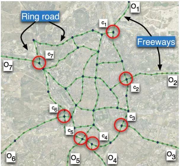 研究人员将假设的目光投向了马德里大都市的预订系统。地图上用红色圈出的那些大点是通勤者可以在城市道路网络上预订空间的地方: