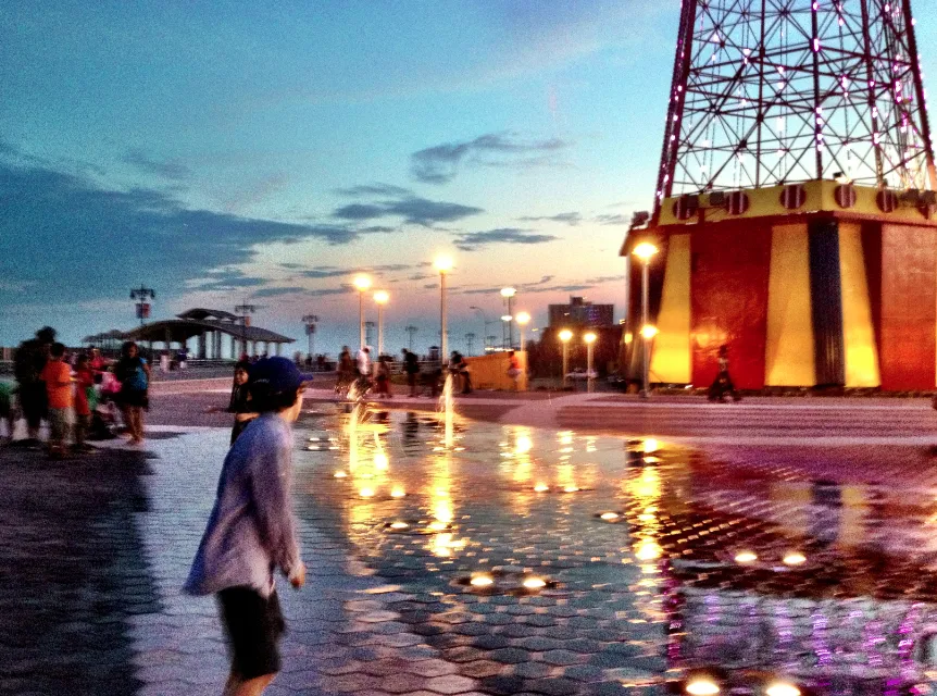在降落伞跳跃的正下方,在一个被称为赛马广场的海滨长廊区域,还有其他几个新景点。老 B&B 旋转木马,另一个曾经濒临灭绝的康尼经典,现在回到了一个新的霓虹装饰的展馆。孩子们在降落伞跳跃的基地的喷泉中玩耍,喷出的水柱在看似随机的间隔中闪烁,发出欢快的尖叫声。