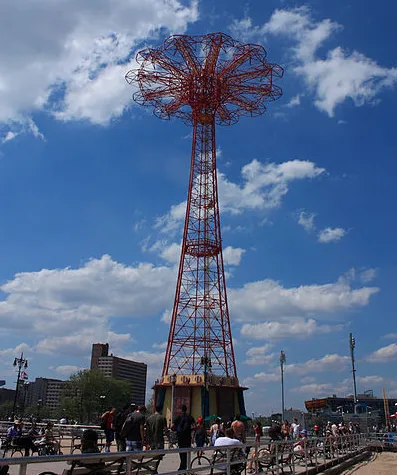 262英尺高的降落伞跳跃是康尼岛众多标志性建筑之一,和内森著名热狗店、奇迹轮和气旋过山车一样,是那里的重要组成部分。它实际上是为1939年在皇后区举办的世界博览会而建,由一位企业家设计,模仿苏联伞兵训练塔,随后在两年后移至康尼岛的Steeplechase公园。乘客通过缆绳系统被提升,然后在一个滑槽辅助的下降中落下,持续时间不超过20秒。一对情侣甚至在这个游乐设施上结婚。