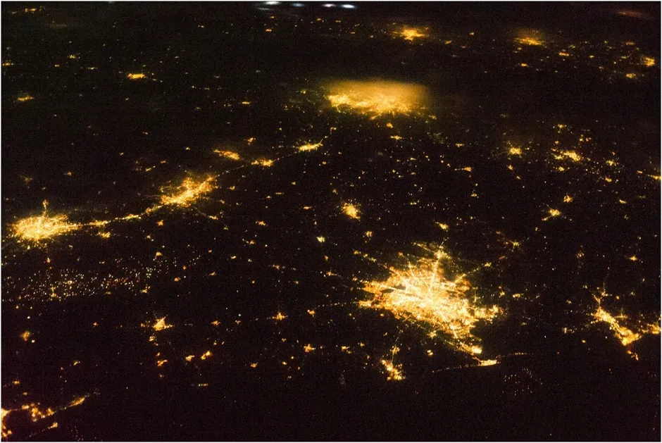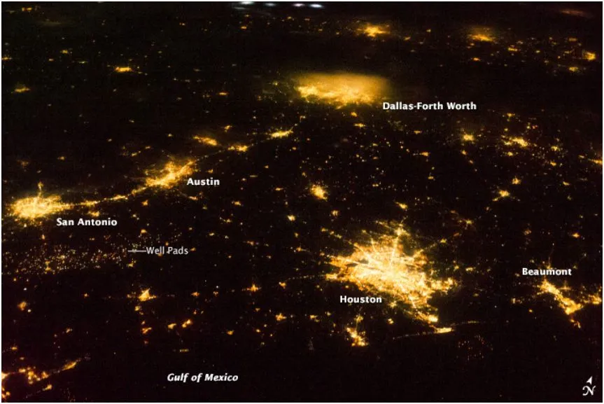 由于涉及到巨大的距离(休斯顿到达拉斯大约230英里),可能很难区分。这张照片中最明显的光源是城市,包括该州四个最大的城市;从达拉斯/沃斯堡向西沿着黄色高速公路行驶,会穿过闪烁的光子绿洲奥斯丁,然后是圣安东尼奥。街灯和建筑灯光使这些城市在黑色沙漠中像篝火一样闪烁,而达拉斯/沃斯堡上方的轻微模糊来自一层流动的云层。