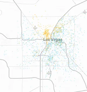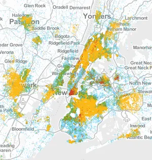 我们在下面的地图中挑选了一些城市,其中一个点代表20个收入低于贫困线的人(白人用蓝色表示;黑人用黄色表示;西班牙裔用绿色表示;亚洲人用红色表示)。但您也可以导航完整工具,其中包括1990年和2000年的中间地图,在这里,或在页面底部。所有这些图片强调了为什么多年前为解决贫困而制定的政策解决方案可能不适合今天的任务。