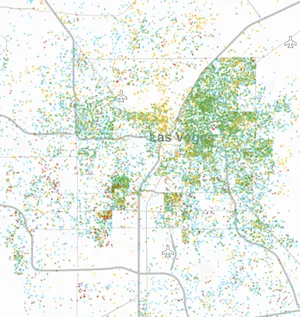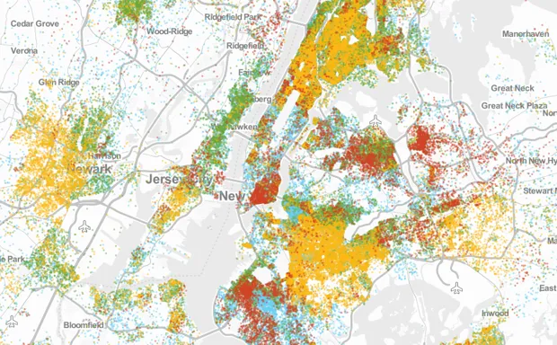 我们在下面的地图中挑选了一些城市,其中一个点代表20个收入低于贫困线的人(白人用蓝色表示;黑人用黄色表示;西班牙裔用绿色表示;亚洲人用红色表示)。但您也可以导航完整工具,其中包括1990年和2000年的中间地图,在这里,或在页面底部。所有这些图片强调了为什么多年前为解决贫困而制定的政策解决方案可能不适合今天的任务。
