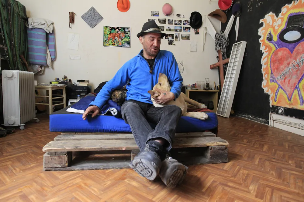 41岁的Aitor Castelruiz来自西班牙圣塞巴斯蒂安,坐在Gesu的房间里,和他的狗Hipy和Tigret在一起,他在这里住了一年。2013年4月18日。路透社/Yves Herman