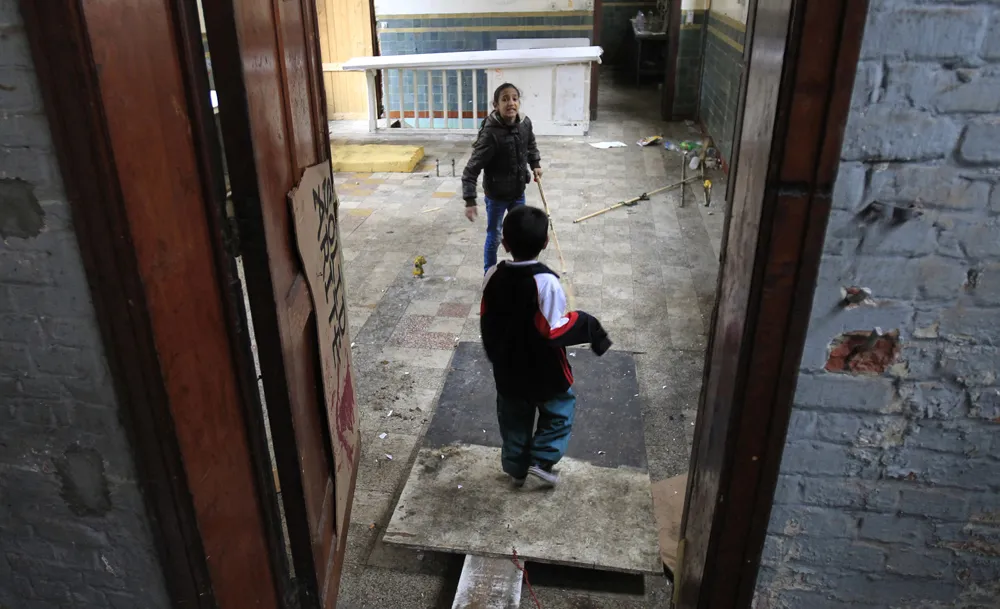 孩子们透过Gesu的一扇破窗户看。2013年4月18日。路透社/Yves Herman