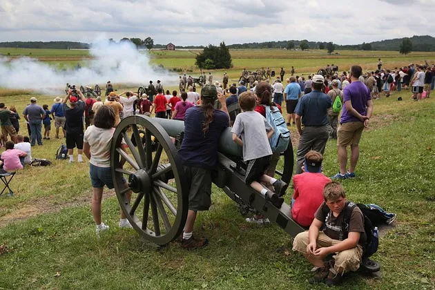 2013年7月2日,宾夕法尼亚州葛底斯堡,游客们观看南方邦内战重演者在葛底斯堡战役150周年纪念日上发射大炮摄影:约翰·摩尔/盖蒂图片社1863年7月,在一场汗流浃背、硝烟弥漫的三天激战中,超过51,000人伤亡,这场战役常被称为美国土地上最血腥的战斗。葛底斯堡战役改变了内战的进程,进而改变了美国的历史。正因如此,150年后的今天,就在这片著名战场的不远处,四名装扮成联邦士兵的男子正互相拍照,耳朵里还插着美国国旗。