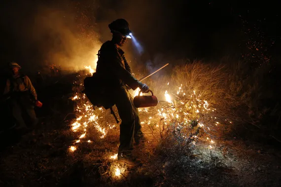 新墨西哥州银城热火队的消防员贾斯廷·罗梅罗使用滴水火炬在波特雷罗路上山建立回火,以控制加利福尼亚州纽伯里公园附近的斯普林斯火灾,2013年5月3日。路透社在早期的低级野火中,幸存的树木为下一代的恢复播下了种子。相比之下,如今,巨型火灾的猛烈热量常常将所有的针叶树种子和幼苗焚烧殆尽,并使土壤失去生育能力,几乎使森林无法再生。
