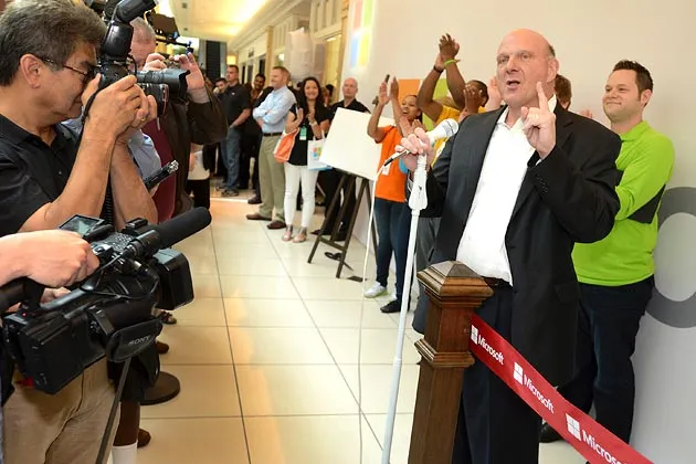 2013年6月28日,微软CEO史蒂夫·鲍尔默在密歇根州特洛伊市一家公司门店盛大开业的现场摄影:Bryan Mitchell/彭博社关于微软首席执行官史蒂夫·鲍尔默,可以这么说:这位先生精通如何重组、重组、再重组。
