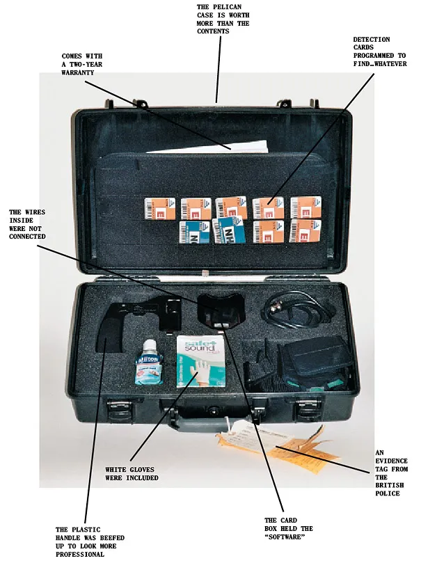 从一开始,马普和怀特就面临着当年美国检察官在Quadro追踪器案件中同样的困境:他们不仅需要证明设备无效,更要证实销售者明知其无效。前者相对简单:英国国防部爆炸物研究实验室的专家拆解测试了ATSC所有产品,确认这些不过是精巧玩具。即便姑且相信所谓"静电分子探测"原理,ADE 651的内部构造也荒诞至极——内部导线根本未连接,塑料制成的枪柄无法导电,有专家作证其天线"与九英寸铁钉无异”。调查人员发现麦考密克在订单激增后便抛弃了编程把戏,运往伊拉克的探测棒内甚至没有彩色贴纸。取而代之的是更唬人的包装:每台设备都配有棉质手套、消毒液,装在昂贵的防水箱中。“全是表面功夫,“马普评价道,“包装盒都比内容物值钱。”