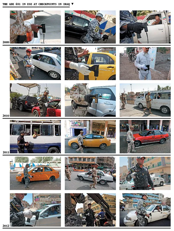 麦考密克的宣传或许显得荒诞,但其设备却印有国际炸弹技术员协会的徽章。2007年1月,伊拉克内政部与ATSC及其代理商签订了五份无竞标合同中的首份,总价达1100万英镑。萨默塞特的梅里奥特塑料公司随即开足马力,启动ADE 651史上最大规模的生产。