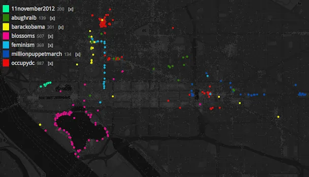 火车红色的点显示了城市中三个主要的占领抗议地点,分别在麦克弗森广场、自由广场和美国国会大厦附近。深绿色则暗示某种阿布格莱布抗议。如果你观看这里的 时间线动画,你会看到女权主义者从白宫的台阶到华盛顿纪念碑突然冒出来,后来还有一次 百万木偶游行前往国会。“11november2012”是对退伍军人节的提及,而那些青柠绿色的点大多聚集在国家广场西端的战争纪念碑附近。至于那些在潮汐盆地周围的粉红色点?那是春天仅出现约两周的樱花。通过时间线,你也可以看到它们的绽放和凋零。