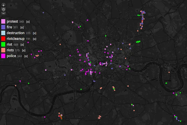 这是来自伦敦的一个类似的历史有趣时刻,拍摄于2011年夏季,当时城市经历了一系列骚乱,分别在“火灾”、“破坏”、“骚乱”等词中有所体现: