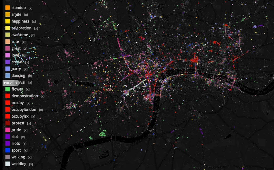 特别是 Flickr工具 包含了大量的数据——照片本身、它们的位置,以及 与之相关的主题标签——可以以无限的方式拼接并在时间上可视化,以说明个别事件,如自然灾害,或特定地理,如与占领抗议者相关的地理。TraceMedia最初在去年在伦敦启动了该项目,但最近更新了它,以包括超过50个全球城市,其中一些的Flickr数据可以追溯到2004年。您可以在特定时间窗口内查看任何城市,或在时间动画中查看,同时绘制多个标签(如上面显示的伦敦地图)。