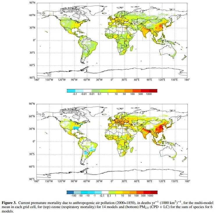 完整研究可在 这里 获取;以下是研究人员制作的几张地图,显示了 1) 由于人为空气污染导致的过早死亡,以及 2) 与气候变化引起的空气污染相关的过早死亡。看看世界上最严重的污染是如何集中在印度、中国和东南亚等发展中国家上方的: