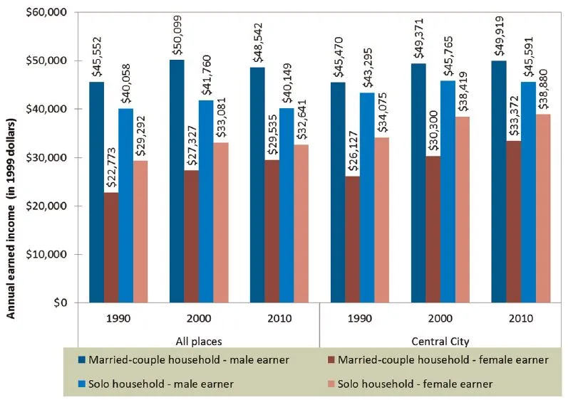德卡表示,许多单身人士涌向城市的部分原因是他们在城市的收入比在外面高。在一篇 即将发表的论文中,城市研究,德卡显示,单身男性和女性在城市生活时每年收入至少多出 5,000 美元。相反,已婚夫妻中的男性收入者(女性收入者的情况稍微好一些)在城市的收入与他们的总体收入大致相同。