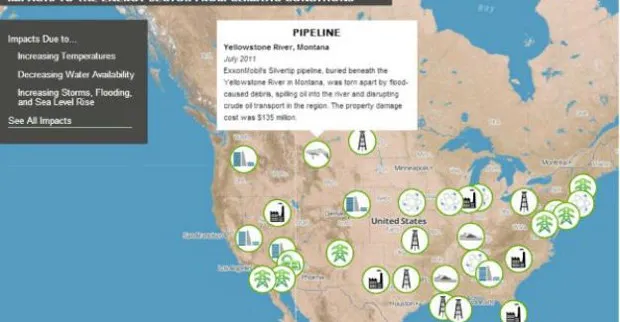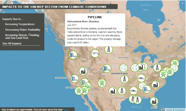 几次令人难忘的大规模停电事件入选,包括桑迪、2004年的飓风珍妮,以及今年二月的重大新英格兰暴风雪。地图还包括一些不太被宣传且不那么明显的灾难性事件,这些事件中气候变化对美国电网产生了影响。例如,去年夏天密西西比河的干旱条件和低水位使驳船运输煤炭和石油等资源变得困难。在光谱的另一端,2011年7月蒙大拿州黄石河的洪水撕裂了一条石油管道,造成1.35亿美元的财产损失。