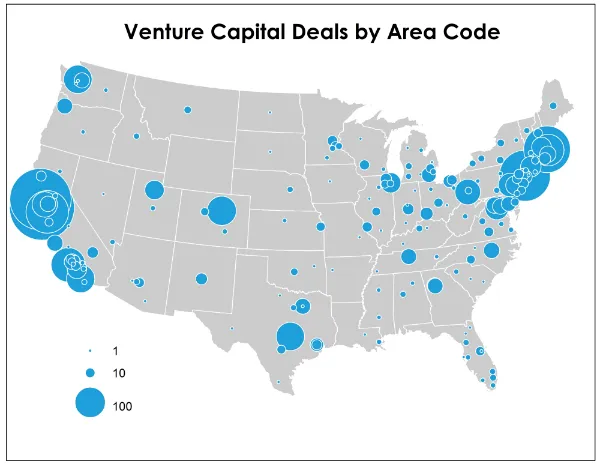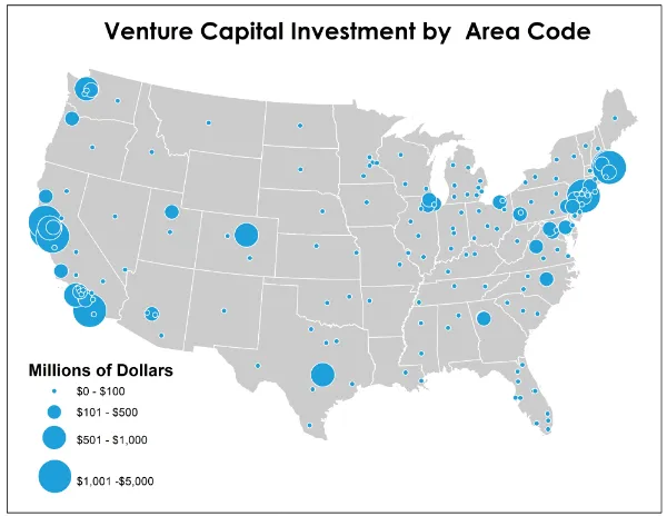 第二张地图(上方)绘制了按区号划分的风险投资投资的美元价值。相同的总体模式显而易见,硅谷和旧金山湾区、南加州以及波士顿-华盛顿走廊的集中度最高。