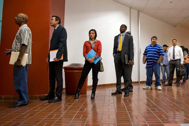 求职者在德克萨斯州圣安东尼奥等待就业博览会的开幕摄影:埃迪·希尔/彭博社 根据堪萨斯城联邦储备银行的两位经济学家的研究,如果美国就业市场以目前的速度持续改善,到2015年夏天将恢复正常。