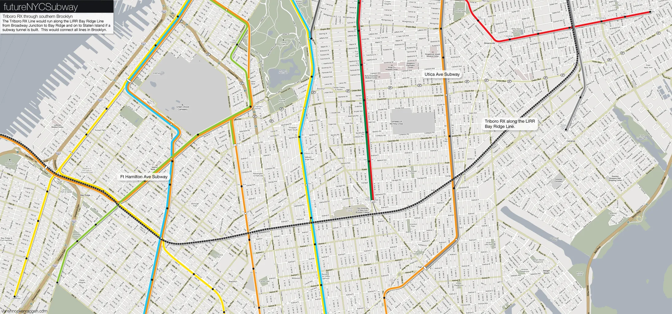 祖潘和同事们在 1996 年将 Triboro Rx 作为 RPA 的 第三个区域计划 提出。该线路穿过外区,X 线将与至少 20 条不同的地铁线路连接——用 1996 年报告的话来说,提供了“无数新的区内和区间选择”。乘客可以从布鲁克林的日落公园通过皇后区的杰克逊高地和阿斯托里亚前往布朗克斯的莫特哈文,而无需经过曼哈顿。