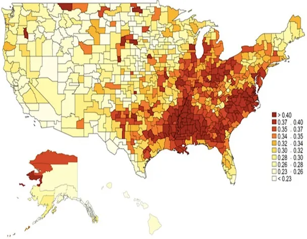 研究人员发现,针对贫困者的更大税收抵免确实与更高的收入流动性相关。但他们的研究更引人注目的是,在全国范围内,儿童摆脱贫困的前景存在“显著差异”,而这些差异的原因可能远远超出地方税收政策。论文中的这张地图展示了代际流动性,比较了儿童成年时的收入排名与其父母的收入排名(按收入百分位数定义)。区域越暗,代际流动性越低: