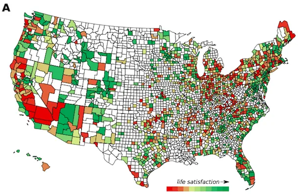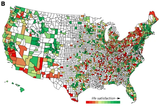 这张来自论文的地图显示了使用更传统的调查结果对生活满意度的测量,在这1300个县中: