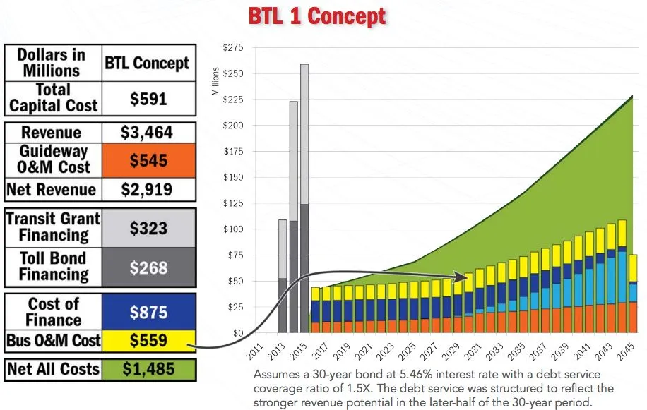 收入预测更是惊人。在为该研究建模的三个走廊中,长度从45到65英里,BTL系统收取的通行费支付了运营和维护公交车的100%成本。特别是对于65英里的路线,可行性研究估计30年的净收入约为15亿美元——这是对估计初始交通补助金3.23亿美元的巨大回报。