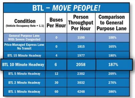 (公共交通爱好者可能会注意到公交收费车道与BRT和HOT车道之间的一些相似之处,尽管存在一些关键差异。适当的BRT走廊将公交车与汽车交通分开,而在BTL走廊中,两者是并排运行的。HOT车道通常允许拼车者免费通行,而一辆有四个人的车和一辆只有一个人的车在公交收费车道中支付相同的费用。)