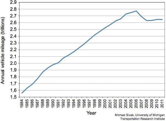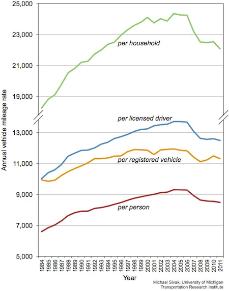 现在他发布了一项后续研究[PDF],关于我们开车的多少。作为一个国家,我们的总里程已经趋于平稳(但由于人口持续增长,我们可能会再次超过2006年的峰值):