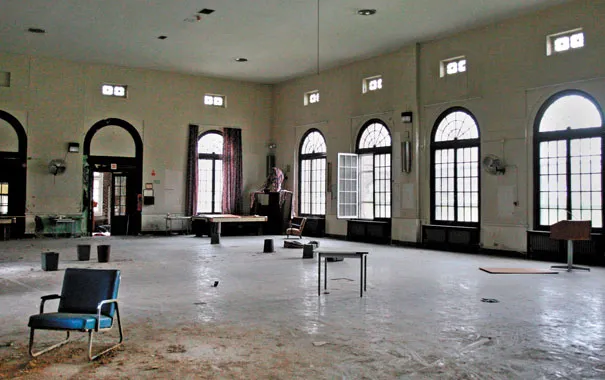 这里还没有准备好,远远不够。首先没有灯。米尔斯发放手电筒并带路进入。地板上有洞。在某些地方天花板正在坍塌。米尔斯说,圣伊丽莎白在1960年代将患者搬出了这栋建筑,但有人忘记关闭供暖。“蒸汽多年来一直开着,”米尔斯感叹道。“这栋建筑从内部开始腐烂。地板相互坍塌。”