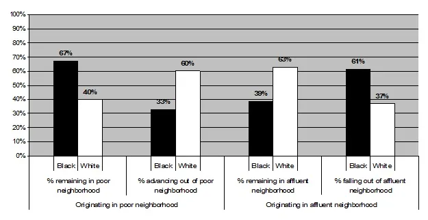 推动本书许多发现的一个发现是,在民权时代,黑人美国家庭所经历的严重社区劣势已经传递给了当前一代,几乎没有变化。三分之二的黑人儿童在一代人之前是在美国最贫困的四分之一社区长大的,现在在类似贫困的社区抚养自己的孩子。过去两代中,约一半的黑人家庭生活在美国最贫困的社区,而白人家庭仅占7%。这些数据表明,社区不平等是多代相传的,像遗传背景和财务财富一样,从父母传递给子女。