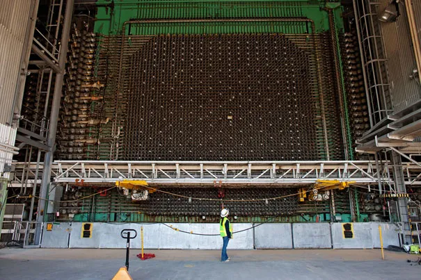 K-East反应堆核心的面貌。中间的网格是一系列曾经装有铀燃料棒的铝管摄影:史蒂夫·费瑟斯通