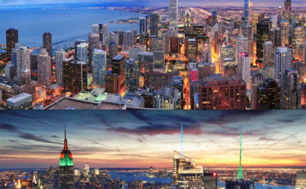 顶部图片:顶部:芝加哥天际线(邓松泉/Shutterstock.com);底部:纽约天际线(邓松泉/Shutterstock.com)