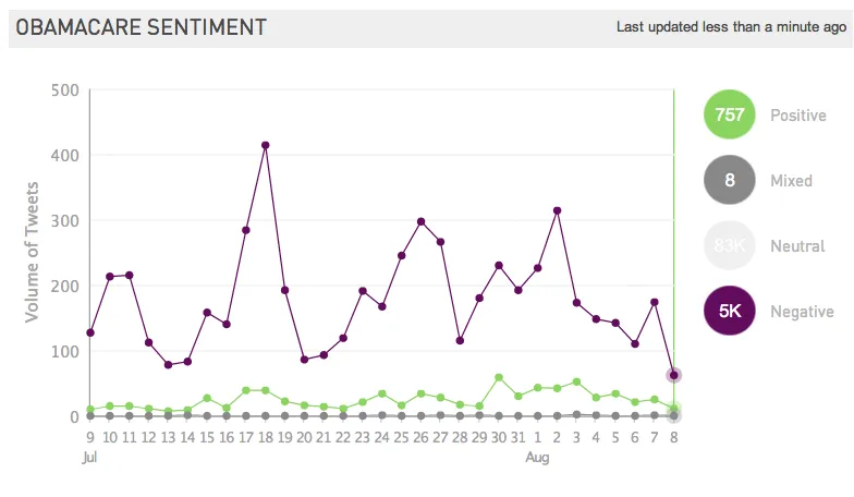 底线:大多数人讨厌它。“对奥巴马总统标志性医疗法的保守派批评者在截至8月4日的30天内主导了关于该问题的Twitter讨论,”CMAG的伊丽莎白·威尔纳在对最新发现的分析中写道。正如这张图表所示,负面情绪的强度大约是正面情绪的六到七倍: