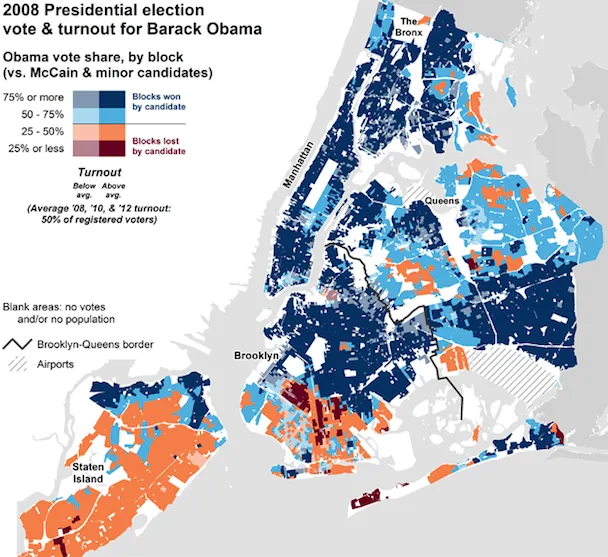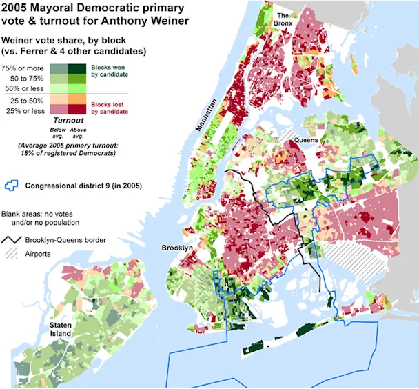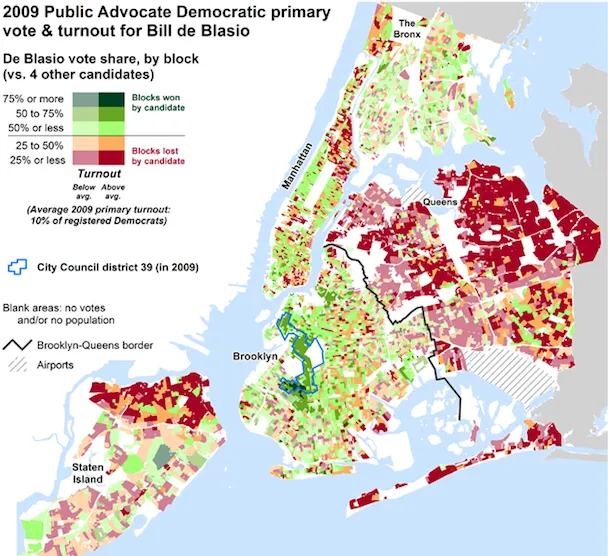 通常,这样的普选、初选和决选结果存在于选区级别(全市大约有6000个这样的单位)。选举地图已经将这些数据重新计算到普查区(全市大约有30000个)。因此,您可以将2005年上面的韦纳地图与比尔·德布拉西奥在2009年竞选公共倡导者时的初选进行比较(皇后区真的不喜欢这个家伙):
