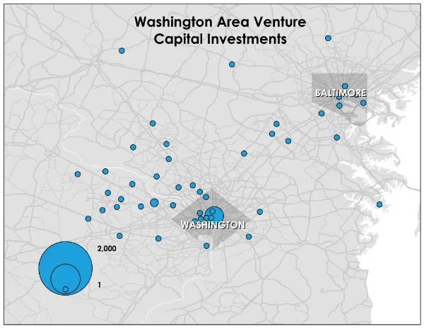 如上图所示,今天的风险投资和初创企业活动也反映了对城市核心的回归;该地区近一半的总投资(47.5%),即6亿美元,流向了华盛顿特区。大部分集中在一个邮政编码(20005)内,该区域涵盖了麦克弗森广场、托马斯圈和洛根圈。城市转变也体现在对混合用途、以交通为导向、适合步行的郊区的显著风险投资上,例如弗吉尼亚州的亚历山大市吸引了近7500万美元的风险投资,马里兰州的贝塞斯达吸引了3400万美元。总体而言,该地区超过三分之二(68.5%)的风险投资集中在主要的城市邮政编码中。
