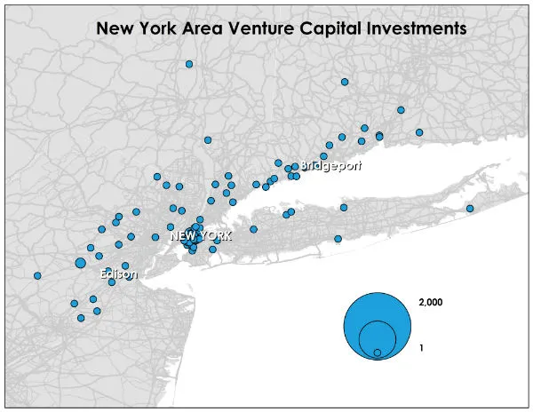 纽约作为风险投资中心的崛起令人惊叹。今天,大纽约地区是美国第三大风险投资融资初创企业中心,2011年吸引了31亿美元的资金,仅次于湾区和大波士顿(见下文)。根据 《新科技城市报告》,在2007年至2011年间,纽约市近500家(486家)初创企业获得了资金——其中15家获得超过5000万美元,27家至少获得2500万美元,81家获得1000万美元或更多。上面的地图显示了大纽约地区风险投资的分布模式。虽然投资遍及整个三州地区,但在下曼哈顿及其周边地区有显著的聚集和集中,从中城区向南经过切尔西(谷歌位于旧港务局大楼)一直到村庄、苏荷和三角洲,并延伸到布鲁克林。