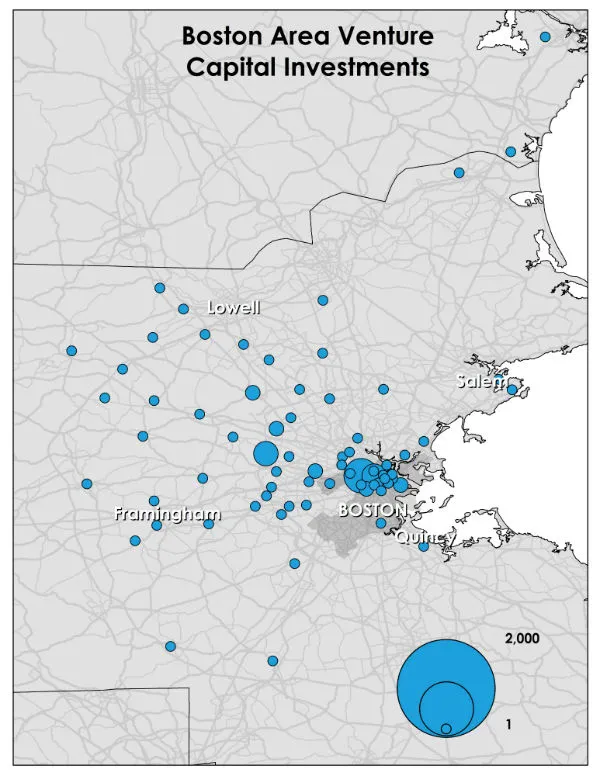 剑桥的两个邮政编码,位于麻省理工学院附近的肯德尔和中央广场,约占9亿美元的风险投资,几乎占波士顿大区总额的三分之一。波士顿市中心占据了前十个邮政编码中的三个,涵盖了后湾、科普利广场和海港区。另一个主要的邮政编码位于东沃特敦,这是一个靠近剑桥的老工业社区。前十个邮政编码中只有三个位于传统的128号公路地区郊区——一个在沃尔瑟姆,一个在贝德福德郊区,一个在列克星敦郊区。
