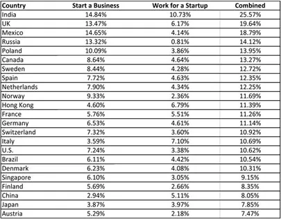 这充其量只是低烧。美国在23个国家的综合排名中位列第16位(见下方完整列表)。在想要创办自己企业的学生中排名第12,在想为初创企业工作学生中排名第18。综合排名的前三名是:印度、英国和墨西哥。