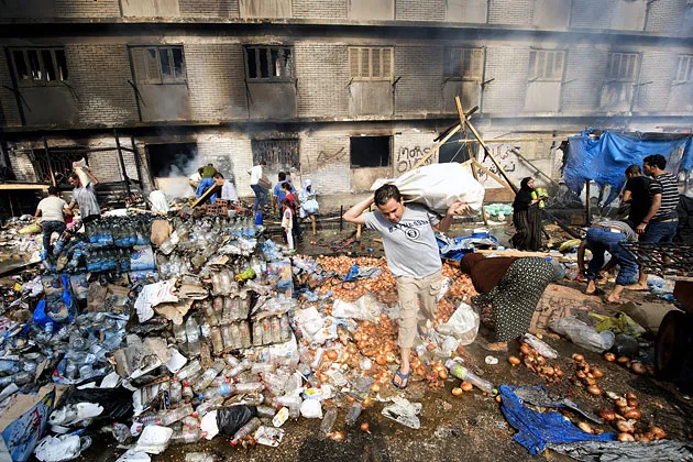 埃及的垃圾收集者和居民检查了8月15日在开罗拉巴阿·阿达维亚清真寺外被摧毁的穆罕默德·穆尔西支持者营地的残骸摄影:Khaled Desouki/法新社通过Getty Images当黄昏降临在开罗尘土飞扬的尖塔和屋顶卫星天线时,这座城市正处于哀悼之中。安全部队与抗议者之间的暴力冲突造成超过530人死亡,数千人受伤;自由派副总统穆罕默德·埃尔巴拉代刚刚宣布辞职,临时总统阿德利·曼苏尔宣布进入为期一个月的紧急状态。