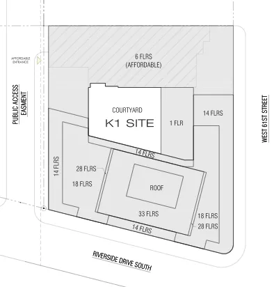 该建筑的经济适用单位将占据二至六层,虽然与建筑相连,但在法律上作为一个独立实体。这个独立实体使Extell能够通过技术上拥有一整栋建筑用于经济适用住房而获得数百万的补贴。更糟糕的是,区域法要求独立建筑必须有独立的入口。