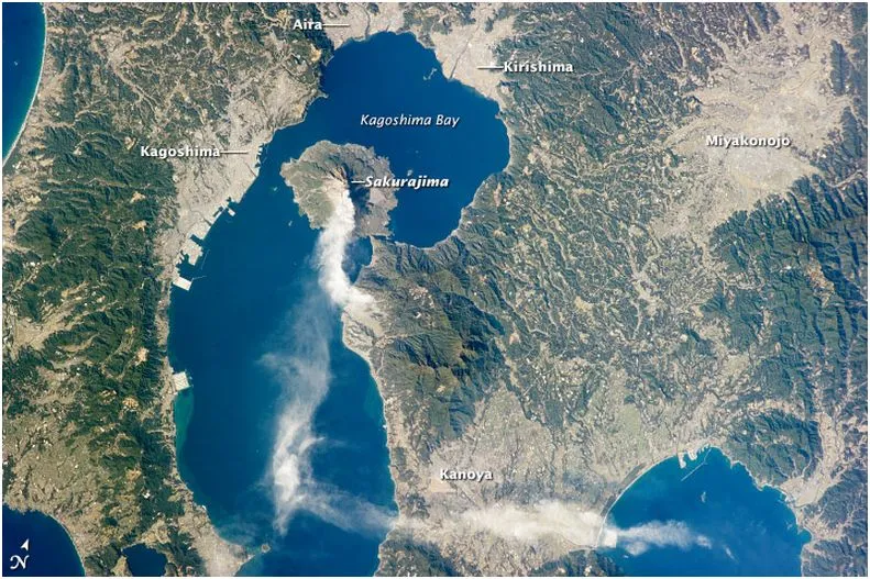 这是樱岛的俯视图,显示它与许多大型城市区域的距离有多近。一位宇航员在今年一月火山喷发的灰烬喷发期间从国际空间站拍摄了这张照片。请注意樱岛南侧的陆桥——它是在1914年一次喷发中形成的,这次喷发使火山不再是一个岛屿: