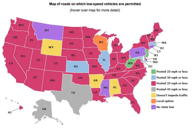 尽管如此,各州仍然拥有最终决定权,决定低速车辆可以行驶的地方。最初的想法是让这一新类型的车辆短途进入城镇,主要在为低速车辆交通合理规划的社区(尤其是退休社区)内行驶,但如今除了四个州之外,其他州都允许低速车辆与常规道路上的交通混合行驶——限制相对较少: