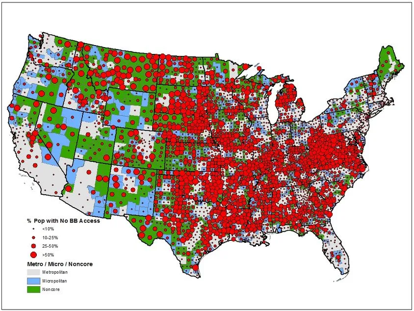 Shutterstock本月早些时候,The Daily Yonder,一个关于美国乡村生活的知名网站,给我们带来了这张令人不安的宽带可用性地图,或者说缺乏可用性,显示了该国的偏远县: