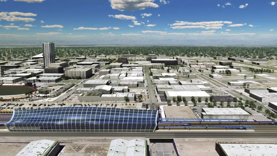 顶部图片:加利福尼亚高速铁路局提供的艺术家渲染图显示了加利福尼亚弗雷斯诺的高速火车站。(路透社)